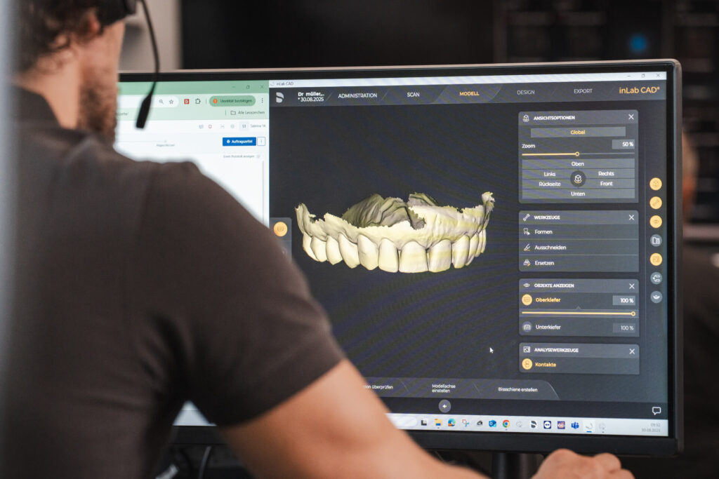 Der Intraoralscan ist berührungslos, erzeugt 3D-Bilder ohne Abdruckmasse und liefert sofort prüfbare Scandaten. Das spart Zeit und verbessert die Planbarkeit.